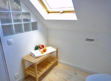A l’étage : la chambre dispose d’un lit double attenante se trouve la salle d’eau avec douche italienne, toilettes.